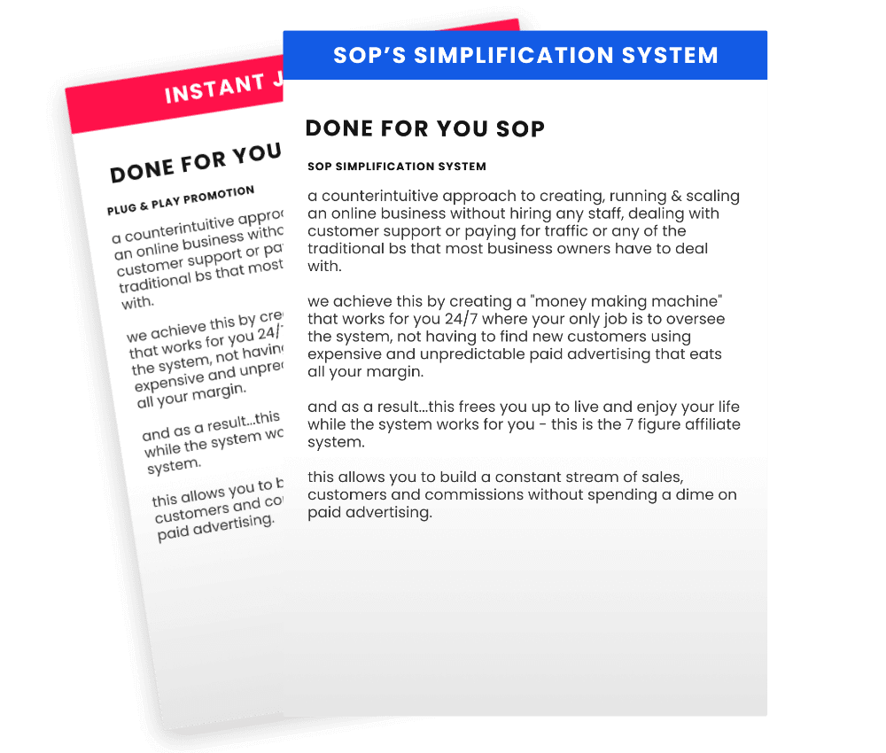 A done for you money making system where you can make up to $417.95 per sale without any of the work required to create your online business.